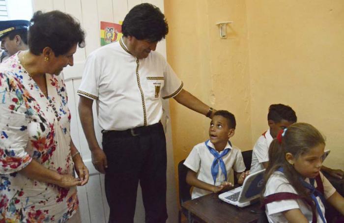 Au terme de son entretien avec Fidel, Evo Morales a fait don de 50 ordinateurs portables et de matériel scolaire à l’école primaire État plurinational de Bolivie, située dans le quartier havanais de Centro Habana. Selon le chef d’État bolivien, c’est la première école dans le monde qui porte le son pays.