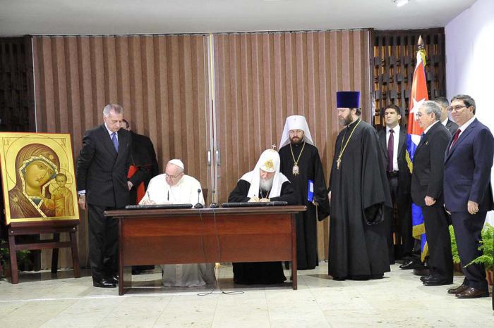 Après des salutations affectueuses, les deux dirigeants de l'Église catholique et de l’Église orthodoxe ont eu un tête-à-tête à huis clos d’environ deux heures, au terme duquel ils ont signé une déclaration conjointe qui comprend trente paragraphes qui témoignent d’une convergence sur de nombreux points et qui revient sur des grands enjeux contemporains comme les conflits au Moyen-Orient et en Afrique du Nord, l’importance du dialogue interreligieux, le droit inaliénable à la vie ou encore le rôle de la famille, entre autres.