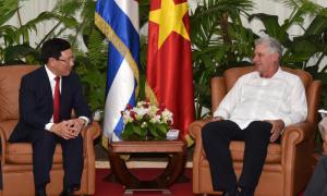 Le président du Conseil d'État et du Conseil des ministres, Miguel Diaz-Canel Bermudez, a rencontré ce lundi le camarade Pham Binh Minh, vice-Premier ministre et ministre des Affaires étrangères de la République socialiste du Vietnam, en visite officielle à Cuba.