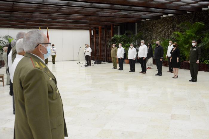 Sur proposition du ministre des Forces armées révolutionnaires (FAR) et du Secrétaire général de la CTC, le chef de l'État a émis le Décret présidentiel 237, qui accorde le titre de Héros du travail de la République de Cuba à 13 camarades. L'un d'entre eux a été décerné, à titre posthume, au vice-amiral Julio César Gandarilla, ancien ministre de l'Intérieur. Son épouse Minerva Sarmiento a reçu la médaille des mains du président Diaz-Canel.