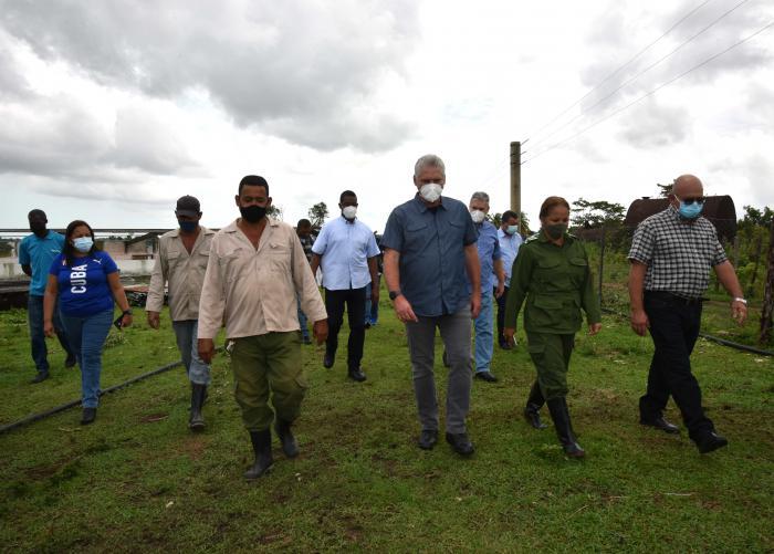 Accompagné du membre du Bureau politique et Premier ministre, Manuel Marrero Cruz, ainsi que d'une représentation de l'équipe gouvernementale du pays, le chef de l'État a pu vérifier en différents points des deux territoires l'avancement des travaux de nettoyage, la réhabilitation des zones de plantation touchées, la restitution des principaux services interrompus et la réponse qui commence à être apportée aux dommages causés aux habitations.