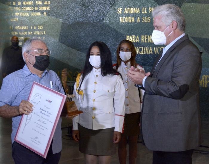 Le Premier secrétaire du Comité central du Parti et président de la République, Miguel Diaz-Canel Bermudez, a remis au journaliste Roberto Pérez Betancourt le prix national du Journalisme José Marti pour l'ensemble de son œuvre, lors d'une cérémonie solennelle qui s'est tenue le lundi 14 mars au mémorial José Martí dans la capitale.
