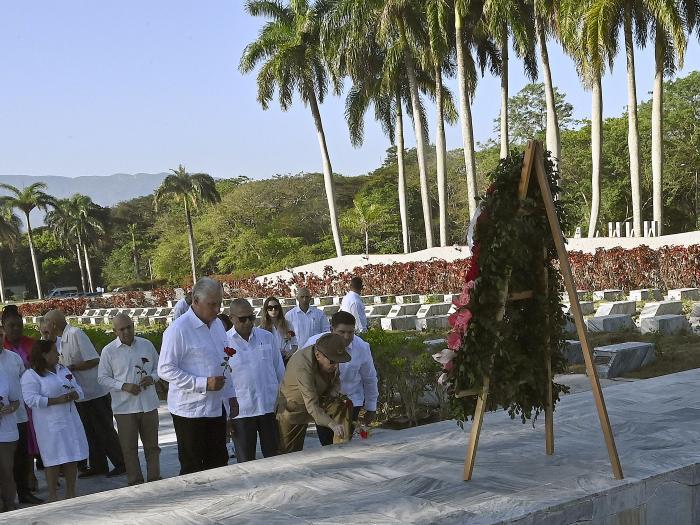Puis, l'hommage s'est déroulé devant la flamme éternelle avec des roses rouges pour les hommes et les femmes qui reposent sous le ciel guérillero du 2e Front oriental, fondé par le général d'armée Raul Castro, une entreprise qui bénéficia du soutien indispensable de sa compagne dans la vie et dans la lutte.
