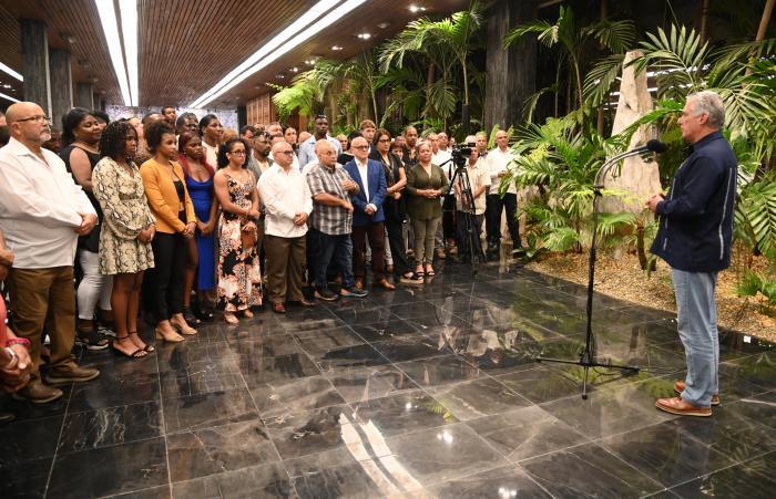 Le président a salué chacun d'entre eux au Palais de la Révolution. Accompagné du membre du Bureau politique et Premier ministre, Manuel Marrero Cruz, et du responsable du Département d'attention au secteur social du Comité central du Parti, Jorge Luis Broche Lorenzo, le chef de l'État leur a souhaité la bienvenue et les a félicités.