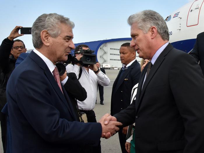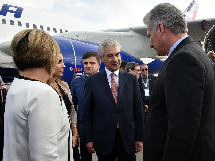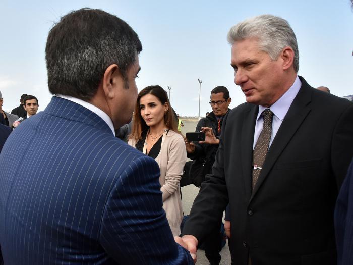 Après avoir fait ses adieux à Minsk – trois heures plus tôt – au président biélorusse Aleksander Loukachenko, Diaz-Canel a été accueilli à l'aéroport international de Bakou par le vice-premier ministre Ali Ahmadov et l'ambassadeur cubain Alfredo Nieves Portuondo. Le ministre des Relations extérieure Bruno Rodriguez Parilla l'attendait également au pied de la passerelle de l'IL-96, alors qu'il participait déjà aux réunions préalables à la tenue du Sommet du Mouvement des pays non-alignés.