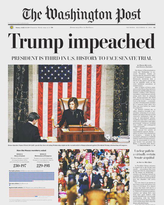 La Chambre des représentants des États-Unis a approuvé mercredi, lors d'une séance historique, l'ouverture d’une procédure de mise en accusation au Sénat contre le président Donald Trump, qui deviendra le troisième président du pays à faire face à une mise en accusation.