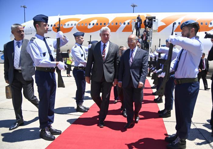 En arrivant à l'aéroport international Humberto Delgado, le chef de l'État, accompagné de son épouse Lis Cuesta Peraza, a été reçu au pied de l'escalier de l'avion par l'ambassadeur du Portugal à Cuba, José Pedro Machado Vieira, ainsi que par Yusmari Diaz Pérez, ambassadeur cubain dans ce pays.