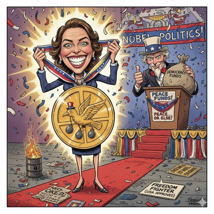 Troisième acte. Le rideau se lève : le secrétaire d'État des États-Unis la nomme pour le prix Nobel de la paix. Il lui est accordé. Le rideau tombe : après l'avoir « gagné », elle le dédie « au peuple vénézuélien et au président Trump pour son soutien décisif à notre cause ». Oui, celui-là même qui pointe quelque 1 200 missiles vers la nation sud-américaine.
