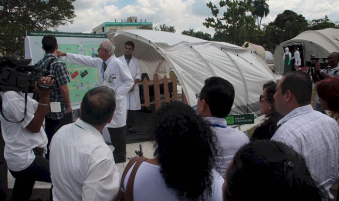 La visite de l’hôpital de campagne et de la salle d’isolement de l’IPK met en évidence l’entraînement spécial reçu par les spécialistes cubains et l’exigence d’une protection stricte, respectant les mesures de sécurité pour le personnel en contact direct avec les patients atteints de la maladie de l’Ébola.