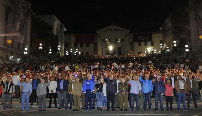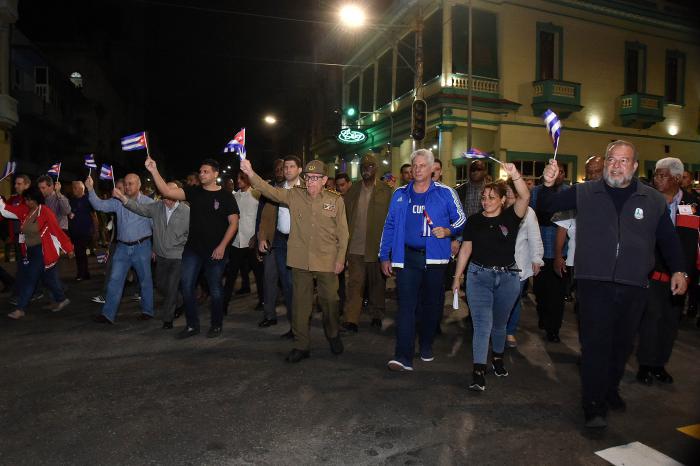 La Marche aux flambeaux a une nouvelle fois été présidée par le général d'armée Raul Castro Ruz, Premier secrétaire du Parti communiste de Cuba, le seul parmi les personnalités réunies ici à avoir participé à la première édition, le 27 janvier 1953, il y a 67 ans. Cette première marche, qui a inauguré la tradition, fut un acte de courage des révolutionnaires qui descendirent dans la rue pour rendre hommage à l'Apôtre sans hésiter un instant devant les tueurs à gages du dictateur Fulgencio Batista ; aujourd'hui, c'est un acte de réparation envers Marti par les nombreuses personnes dignes face à d’autres autres qui ne le sont pas, paraphrasant les paroles du Maître.
