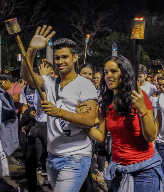 Il est 22 heures, et en ce moment les marches de l'Université de La Havane semblent encore plus imposantes, à la veille du 167e anniversaire de la naissance de José Marti. Les flambeaux agités, la fumée qui se répand dans le ciel, les gens émus, la solennité de la rencontre unie à la jubilation de la jeunesse... il nous appelle à cette heure avec plus de force que jamais et comme dans ses vers : « Lorsque sous le poids de la croix / L’homme se résout à mourir / Il sort faire le bien, il le fait et revient / Comme dans un bain de lumière. »