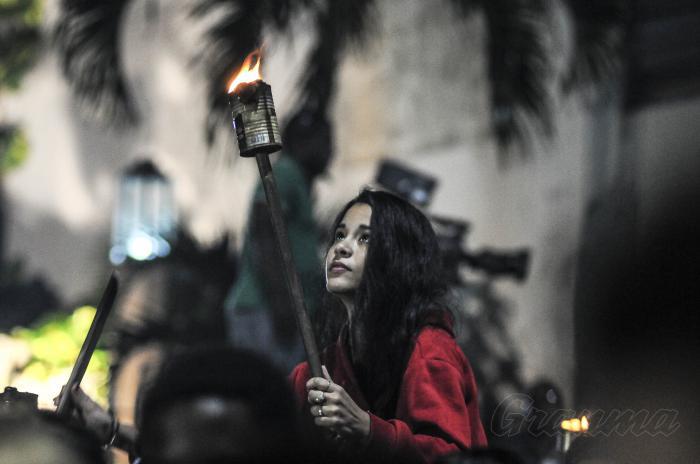 Il est 22 heures sur les marches du Grand Escalier de l'Université de La Havane. La statue de l'Alma Mater se dresse, majestueuse, parmi les torches portées par des milliers de mains, dans des proportions jamais vues auparavant. L'image de José Marti, sur le côté droit par lequel la foule descend maintenant, prend vie. Les tons noirs et gris que nous avons vus sur ses photos de l'époque disparaissent, et le visage du Maître est illuminé par les reflets rouges, orange et jaunes des feux.