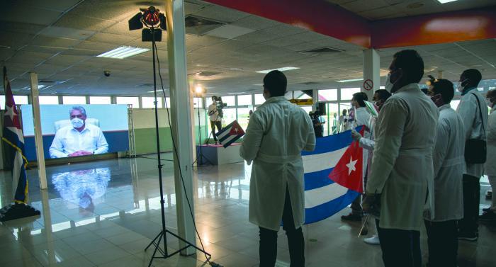 Il y a quelques minutes à peine que la réunion quotidienne du groupe temporaire de travail qui a mené les actions pour faire face à la pandémie s'est achevée, et nous sommes restés ici, un groupe de compañeros, pour participer à cet accueil à distance, que nous rendrons plus intime lorsque votre quarantaine sera terminée ; et nous n'avons pas voulu non plus violer tous les protocoles établis par le pays pour prévenir la transmission de cette pandémie.