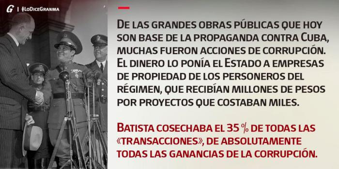 Parmi les grands travaux publics qui sont aujourd'hui à la base de la propagande contre Cuba, comme un symbole de la réussite de cette république bourgeoise, beaucoup furent le fruit d'actes de corruption. L'argent fut versé par l'État à des entreprises appartenant à des membres de la clique du régime, qui reçurent des millions de pesos pour des projets qui en coûtaient des milliers.