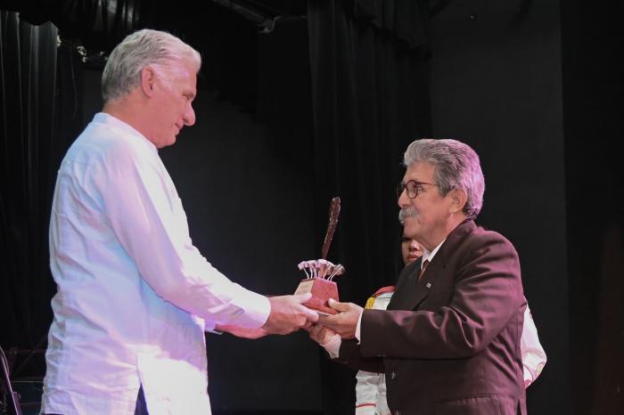 Le Premier Secrétaire du Comité central du Parti communiste de Cuba et président de la République, Miguel Diaz-Canel Bermudez, ainsi que le président de l'UPEC, Ricardo Ronquillo, ont remis les prix aux lauréats du prix national de journalisme José Marti 2023 pour l'œuvre de la vie : Marina Menéndez, José Antonio Fulgueiras, Roberto Ferguson, Juvenal Balan et Héctor Ochoa (absent pour des raisons de santé).