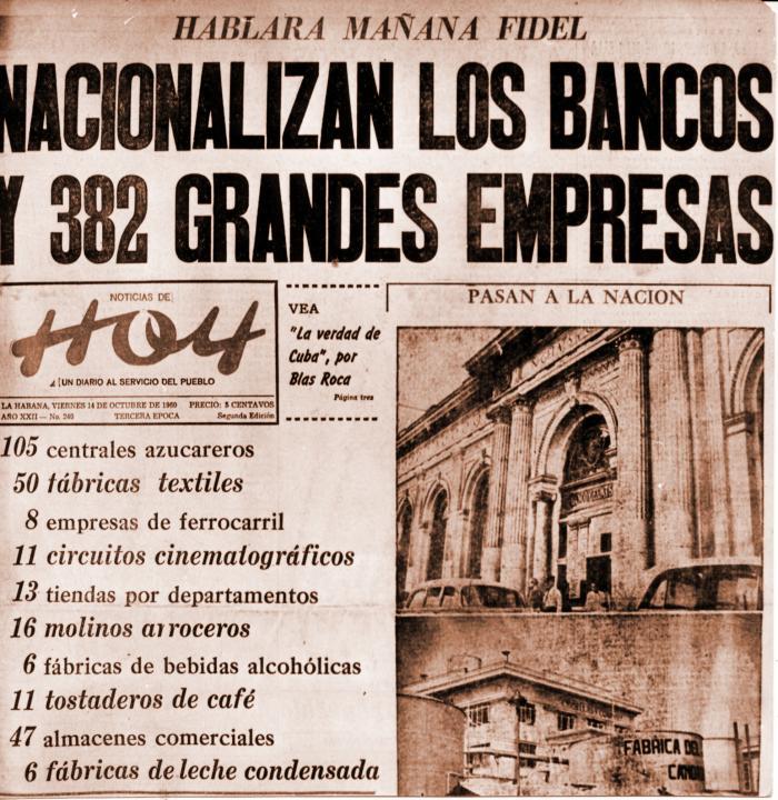 Par la Loi n° 891 du 13 octobre 1960, le gouvernement révolutionnaire ordonna la nationalisation des banques cubaines et étrangères, à l'exception des banques canadiennes (dont la nationalisation se fit par l'achat de leurs actifs), ainsi que la liquidation du Fonds de stabilisation monétaire et du Fonds des hypothèques assurées.