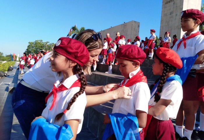 Sur la place qui a l'honneur de porter le nom de l'être humain que tant de gens veulent imiter, il y avait les « pionners » (élèves du primaire) qui ont remplacé le bleu de leur écharpe par le rouge qui symbolise le sang versé, dont la petite Jimena de la Caridad Galvez, de l'école Octavio de la Concepción y de la Pedraja. Sa petite silhouette n'a pu cacher les larmes d'émotion lorsque, à l'ombre de la statue du Che, il a reçu des mains d'Ailyn Alvarez Garcia, membre du Conseil du Stade et Première secrétaire du Comité national de l'Union de la jeunesse communiste (UJC), le nouvel attribut. Comme elle, l'enfant Leoni Manuel Gonzalez, a été très heureux lorsque sa mère, Lianetsy, lui a passé autour du cou l'écharpe qui l'identifie désormais comme un pionnier José Marti, avant de prononcer la phrase que des millions de Cubains ont scandé au cours de ces années glorieuses et pleines de vicissitudes : « Nous serons comme le Che ! ».