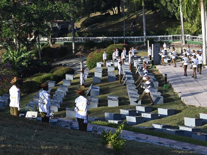 En hommage posthume aux combattants, le clairon joue la sonnerie aux morts et le peloton tire une salve de trois tirs. Puis on entend les accords de la Marche du 26 juillet et Raul, accompagné de Diaz-Canel, du commandant de l'armée rebelle José Ramon Machado Ventura et d'autres dirigeants du Parti et de l'État présents à la cérémonie, déposent des roses blanches devant la flamme éternelle qui veille sur les héros.