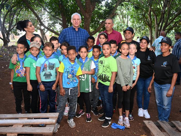 Lors de la visite des différentes zones de la ferme, en compagnie de Roberto Morales Ojeda, membre du Bureau politique et secrétaire à l'Organisation, Diaz-Canel s'est entretenu avec un groupe de jeunes pionniers faisant partie du cercle d'intérêt qui a été créé, dans le but de connaître et de protéger l'environnement et d'autres questions connexes.