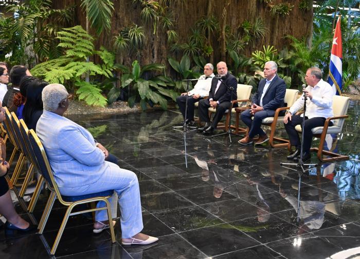 Le Président les a remerciés pour leur présence sur l'Île, car, a-t-il souligné, au milieu « du blocus si cruel auquel nous sommes soumis et de la campagne d'intoxication médiatique qui vise à déformer notre réalité », votre présence ici « a une grande signification pour nous ».