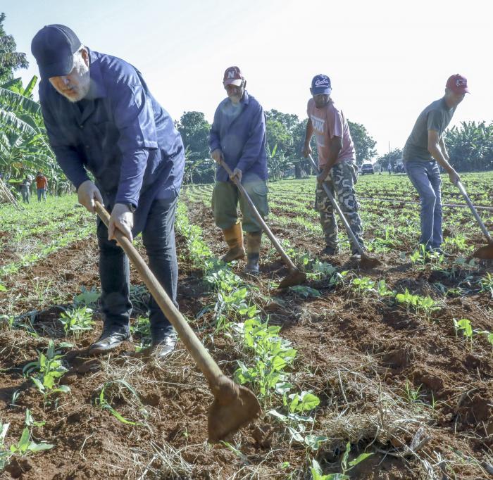 À Artemisa, près de La Havane, et avec ses compagnons du Comité central – parmi eux Roberto Morales Ojeda, membre du Bureau politique et secrétaire à l’Organisation –, le Premier secrétaire a travaillé à l’ensemencement des terres.