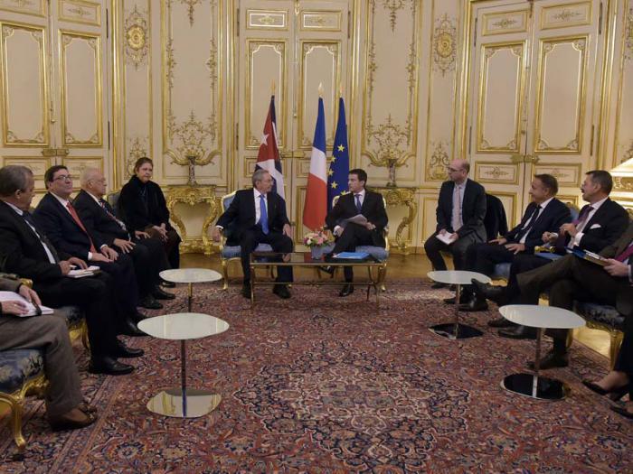 La journée marathonienne de la délégation cubaine s’est poursuivie par une réunion avec le Premier ministre, Manuel Valls, à l’Hôtel Matignon, un entretien qui a confirmé l’excellent état des relations et la dynamique des échanges entre les deux gouvernements, conformément aux accords issus de la visite de François Hollande à La Havane. Afin de donner continuité à cette rencontre importante d’il y a neuf mois, Raul Castro a invité le Premier ministre français à se rendre à Cuba.